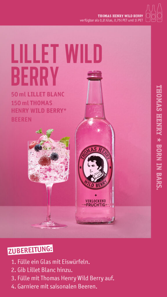 Thomas Henry Wild Berry bringt Frucht und Kohlensäure. Langsam auffüllen, einmal kurz rühren. So bleibt die Spannung im Glas.