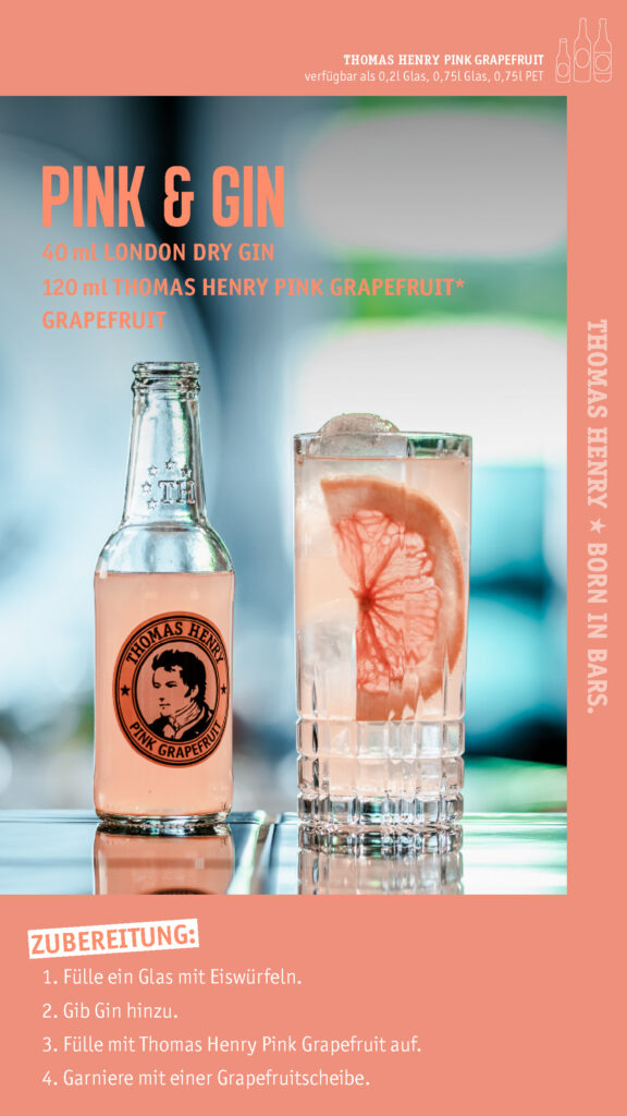 Thomas Henry Pink Grapefruit bringt Kohlensäure und Struktur. Langsam auffüllen, einmal kurz rühren – mehr braucht es nicht.